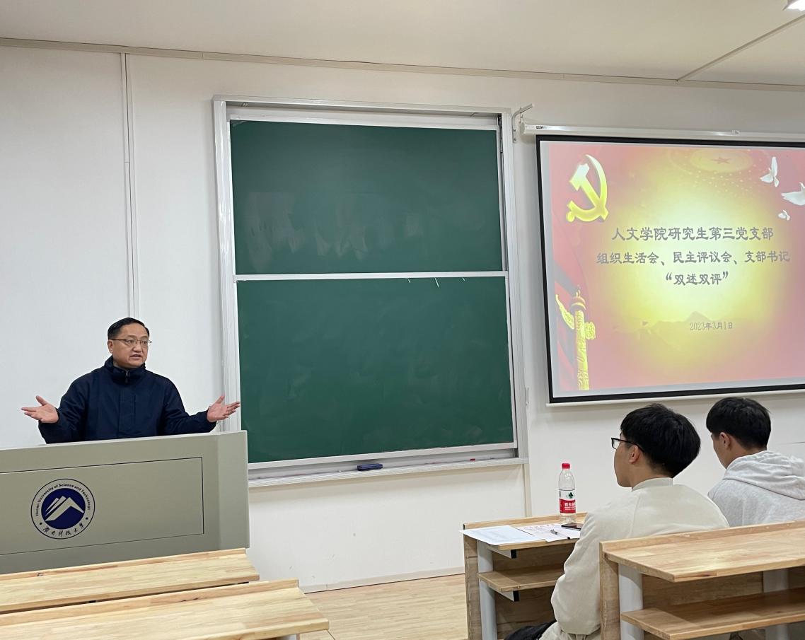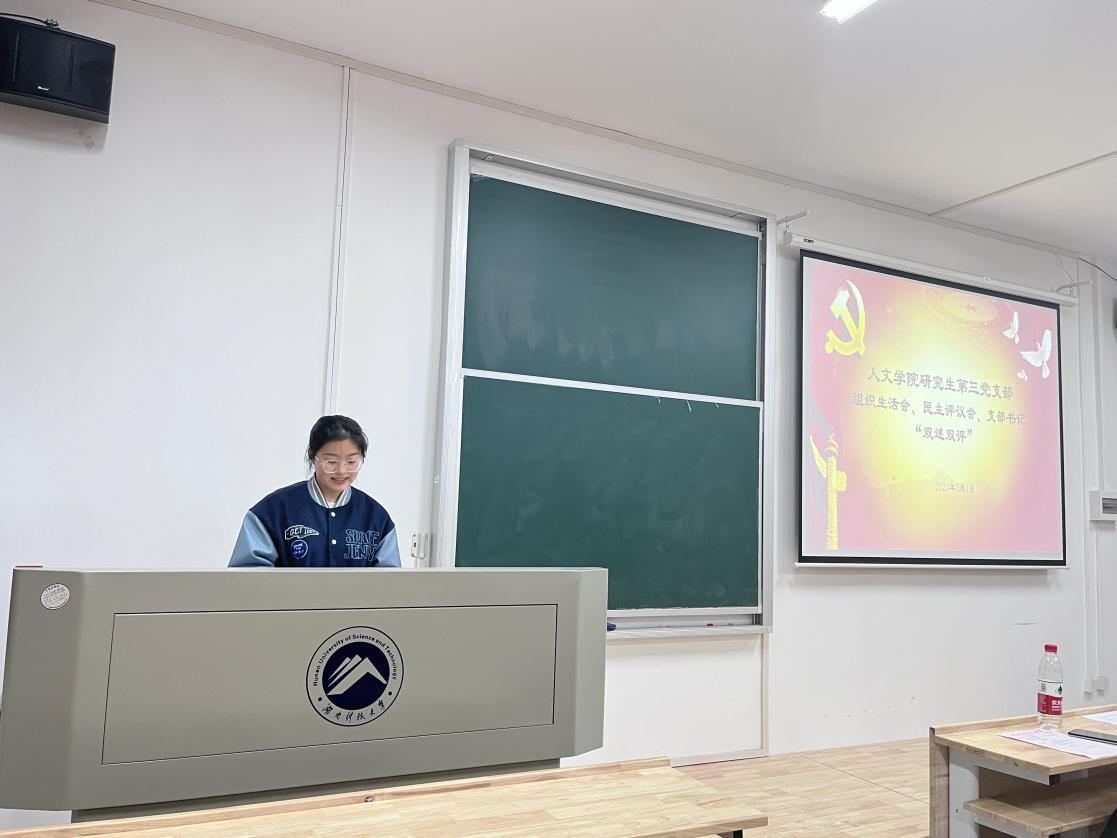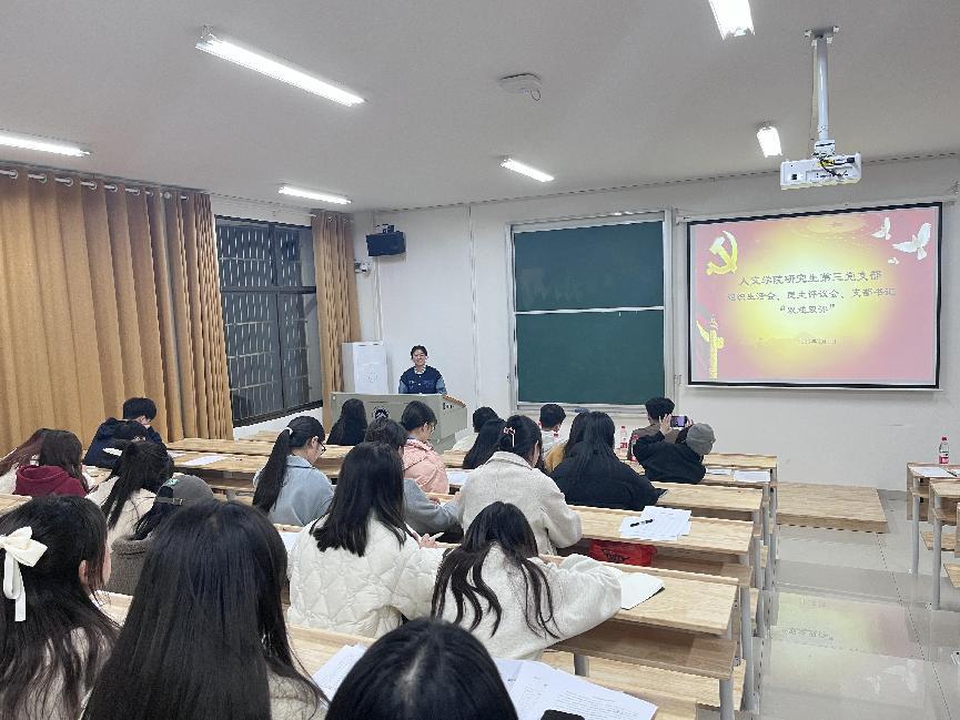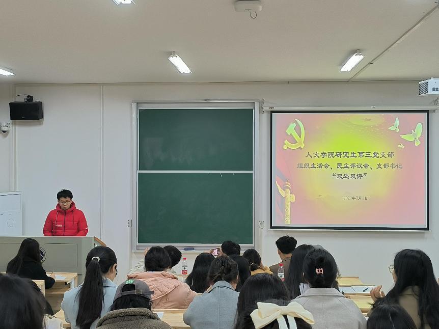 3月1日晚,人文學(xué)院研究生第三黨支部組織生活會(huì)、民主評(píng)議會(huì)、支部書(shū)記“雙述雙評(píng)”會(huì)在我校雨湖校區(qū)2教101教室召開(kāi)。人文學(xué)院黨委委員、副院長(zhǎng)袁星潔教授、第三黨支部32位正式黨員以及5位群眾代表參加會(huì)議。