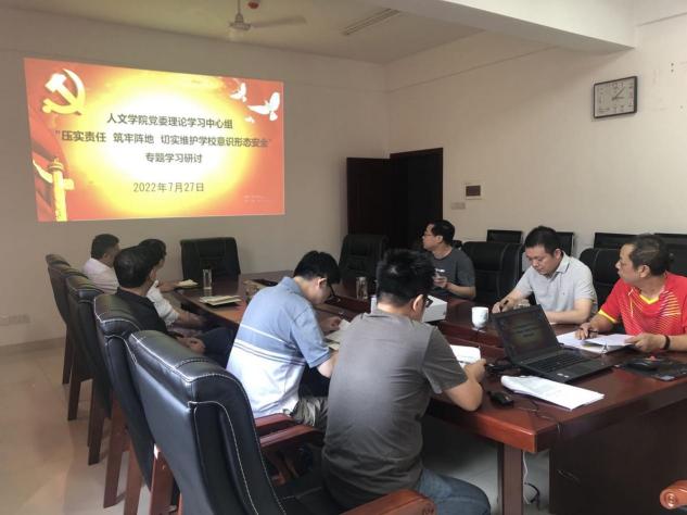 2022年7月27日,人文學院學院黨委理論學習中心組在立言樓B505室開展“壓實責任 筑牢陣地 切實維護學校意識形態(tài)安全”專題集中學習,集中學習由曾志東書記主持,全體黨委委員和黨政辦負責同志參加了本次集中學習。