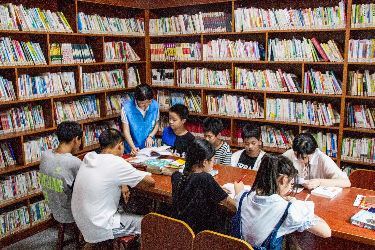 ▲志愿者在指導同學們讀書