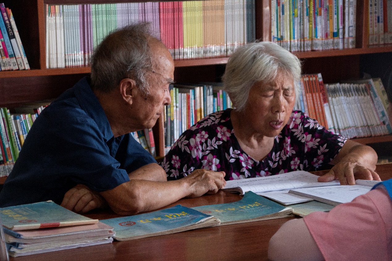 ▲夏昭炎教授與老伴楊蓮金為志愿者介紹讀書屋情況