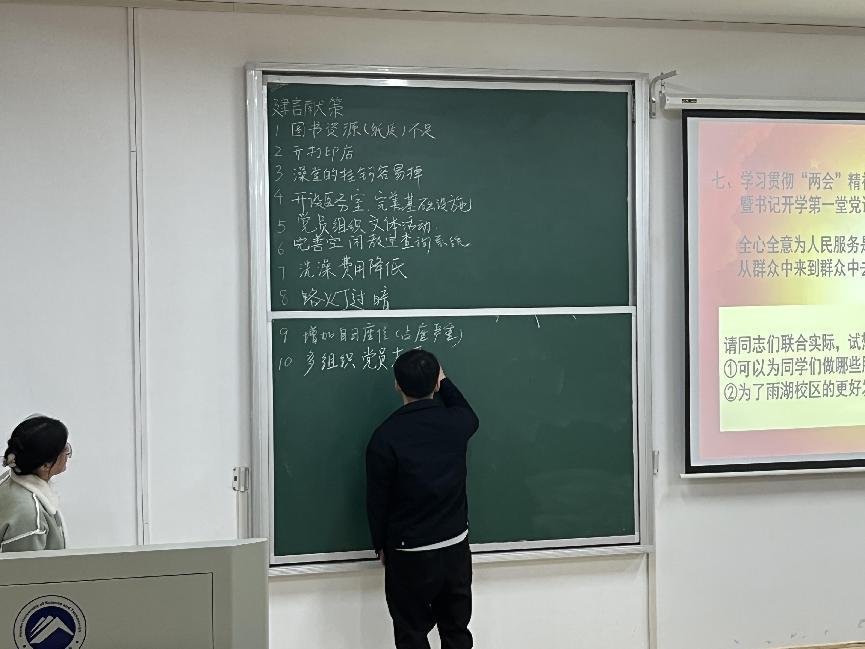 本次活動(dòng)由研究生第三黨支部書記戚路堯同志主持。活動(dòng)開始前,戚路堯熱情地向各位黨員進(jìn)行提問(wèn),并在互動(dòng)的過(guò)程中介紹了前不久召開的全國(guó)“兩會(huì)”的基本知識(shí),現(xiàn)場(chǎng)氣氛活躍。隨后,戚路堯帶領(lǐng)第三黨支部全體黨員認(rèn)真學(xué)習(xí)了習(xí)近平總書記在“兩會(huì)”上的重要講話,并借助圖解的形式回顧了《2023年國(guó)務(wù)院政府工作報(bào)告》。在講解中,戚路堯?qū)Ⅻh的方針政策和理論知識(shí)與研究生的學(xué)習(xí)、就業(yè)等聯(lián)系起來(lái),貼近實(shí)際、易于理解。她強(qiáng)調(diào),作為研究生黨員,要了解時(shí)事政治,強(qiáng)化使命擔(dān)當(dāng),踐行黨員的責(zé)任和義務(wù)。最后,戚路堯邀請(qǐng)各位黨員為提升為同學(xué)服務(wù)水平、推動(dòng)昭潭書院校區(qū)發(fā)展建言獻(xiàn)策。第三黨支部的黨員同志們紛紛響應(yīng),提出了“多組織黨員志愿活動(dòng)”“為同學(xué)解答入黨流程”等10余條建議。