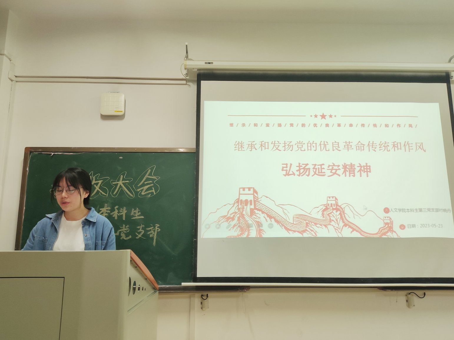 為了讓“微黨課”更鮮活、接地氣,本科生第三黨支部鼓勵(lì)人人上臺(tái),讓黨員“唱主角”。人文學(xué)院本科生第三黨支部成員付曉丹帶來(lái)了微黨課“學(xué)習(xí)習(xí)近平總書(shū)記重要文章《繼承和發(fā)揚(yáng)黨的優(yōu)良革命傳統(tǒng)和作風(fēng) 弘揚(yáng)延安精神》”,她向大家介紹了黨的七大在黨歷史上的重要地位以及延安精神的具體內(nèi)涵,并播放了《延安整風(fēng)和百年大黨的青春密碼》,帶領(lǐng)大家進(jìn)一步領(lǐng)悟延安精神。