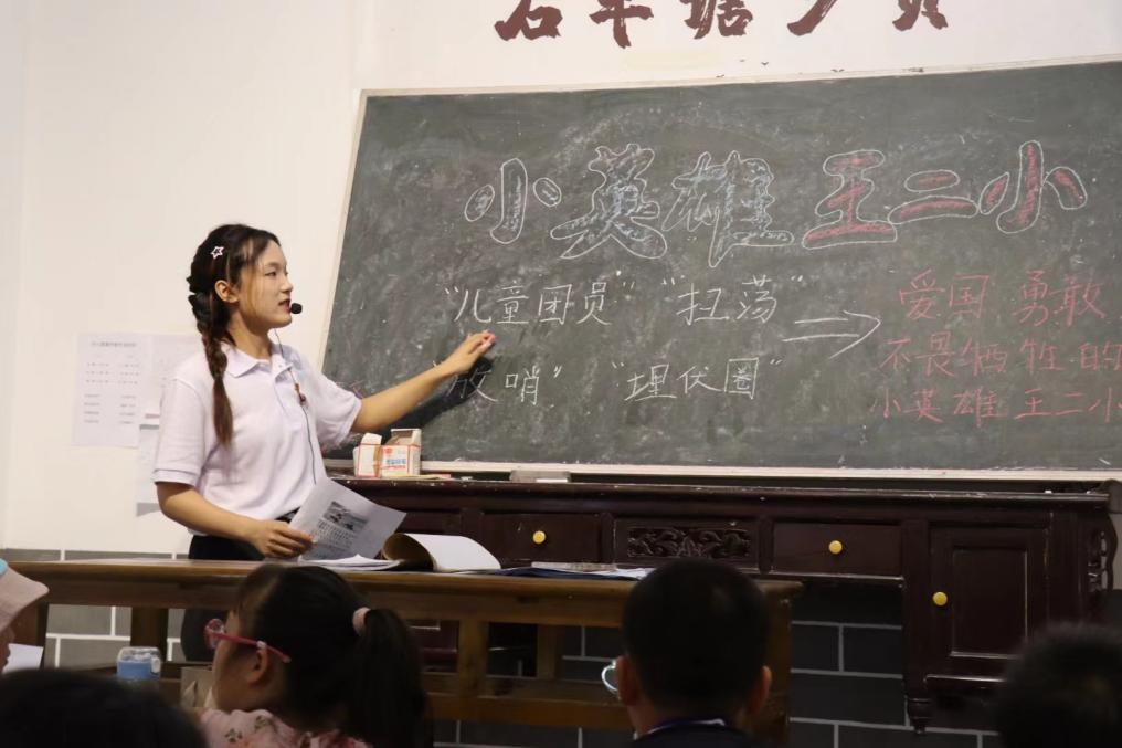 在二年級的課堂上,志愿者龍楊慧生動形象地為同學們講述了小英雄王二小的愛國革命歷程,同時通過舉手回答趣味問題的環(huán)節(jié),調(diào)動學生們的課堂積極性。在龍楊慧的不斷鼓勵下,二年級小朋友們高舉著小手積極回答問題,稚嫩的童音在教室響起,“是王二小用生命保護了村子里許多人,他是我們要學習的英雄。”學生郭李睿大聲說道。