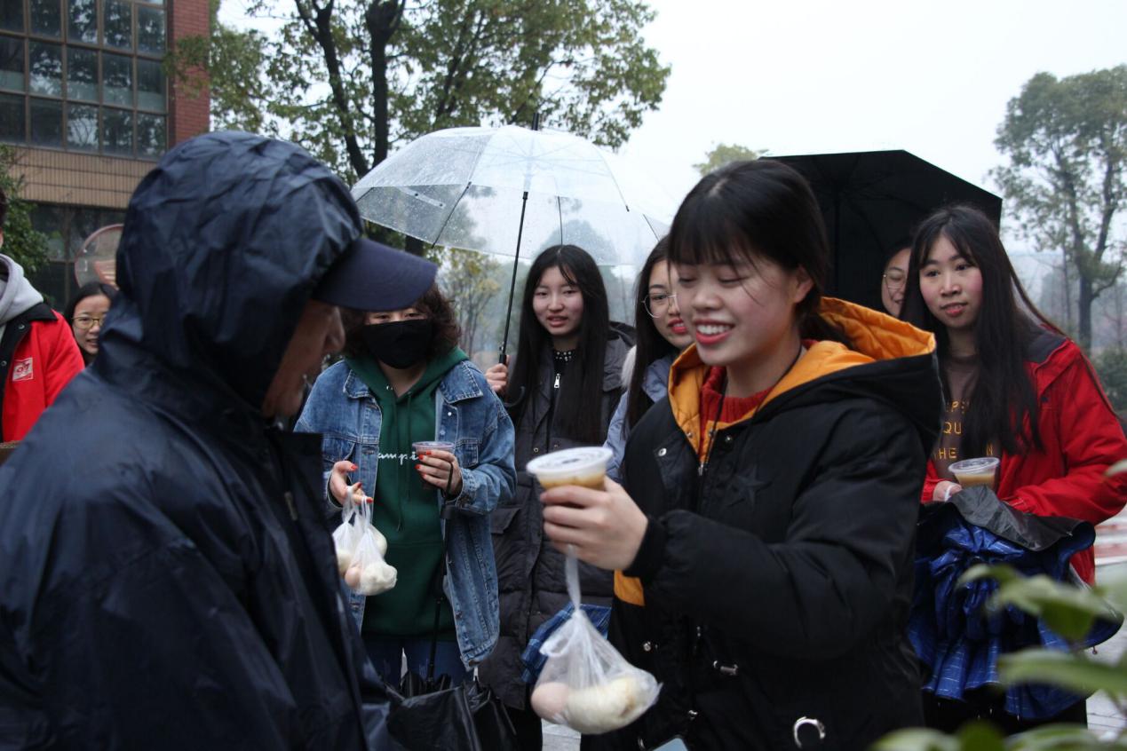 初春的寒意未散,吳玉容學姐與人文志愿團成員在校園里裹著棉襖,撐著雨傘,在等待路過的校園工作者。雖然這次是為了本次活動而特意早起,但是與常年起早貪黑工作的校園工作者相比,這點小苦小累實在是算不了什么。而環(huán)衛(wèi)工們,拖著沉重的垃圾車,穿著塑料雨衣,與大家形成了鮮明的對比。