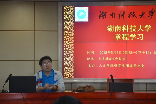 5月7日下午,我院于立言樓4—1會議室組織研究生集體學(xué)習(xí)《湖南科技大學(xué)章程》。研究生輔導(dǎo)員成偉明老師擔(dān)任主講人,全體研究生參加學(xué)習(xí)。