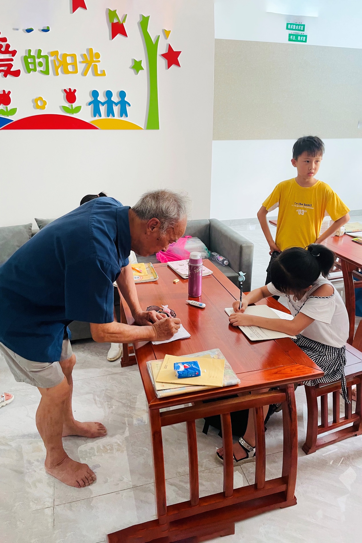 志愿者們積極熱情的服務(wù)不僅讓孩子們感受到學(xué)習(xí)的樂趣,同時(shí)也贏得了家長(zhǎng)的信任。在教室外的涼亭中里,零星家長(zhǎng)圍坐閑談。“今年暑假小孩沒有去父母那,留在鄉(xiāng)下,我就想著把他送到這學(xué)習(xí)。”徐塘斌的爺爺笑著說道。還在上幼兒園的湯麗榮“預(yù)定”了明年下半年的名額。湯麗榮的媽媽說,“今天帶她來看看,了解一下情況,明年暑假再把她送到這里來上一年級(jí)。”