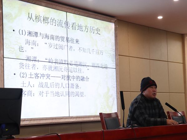 12月9日下午,教育部長江學者特聘教授、中山大學社會學與人類學學院周大鳴教授應邀于立言樓B4-1開展以“湘潭檳榔的傳說與際遇”為題的學術講座。我院李勝清教授擔任主持人,廖君湘教授、羅淵教授、潘年英教授、胡鐵強副教授、胡志明博士以及文藝學研究生代表和部分18級漢語言文學專業(yè)同學到場聆聽。