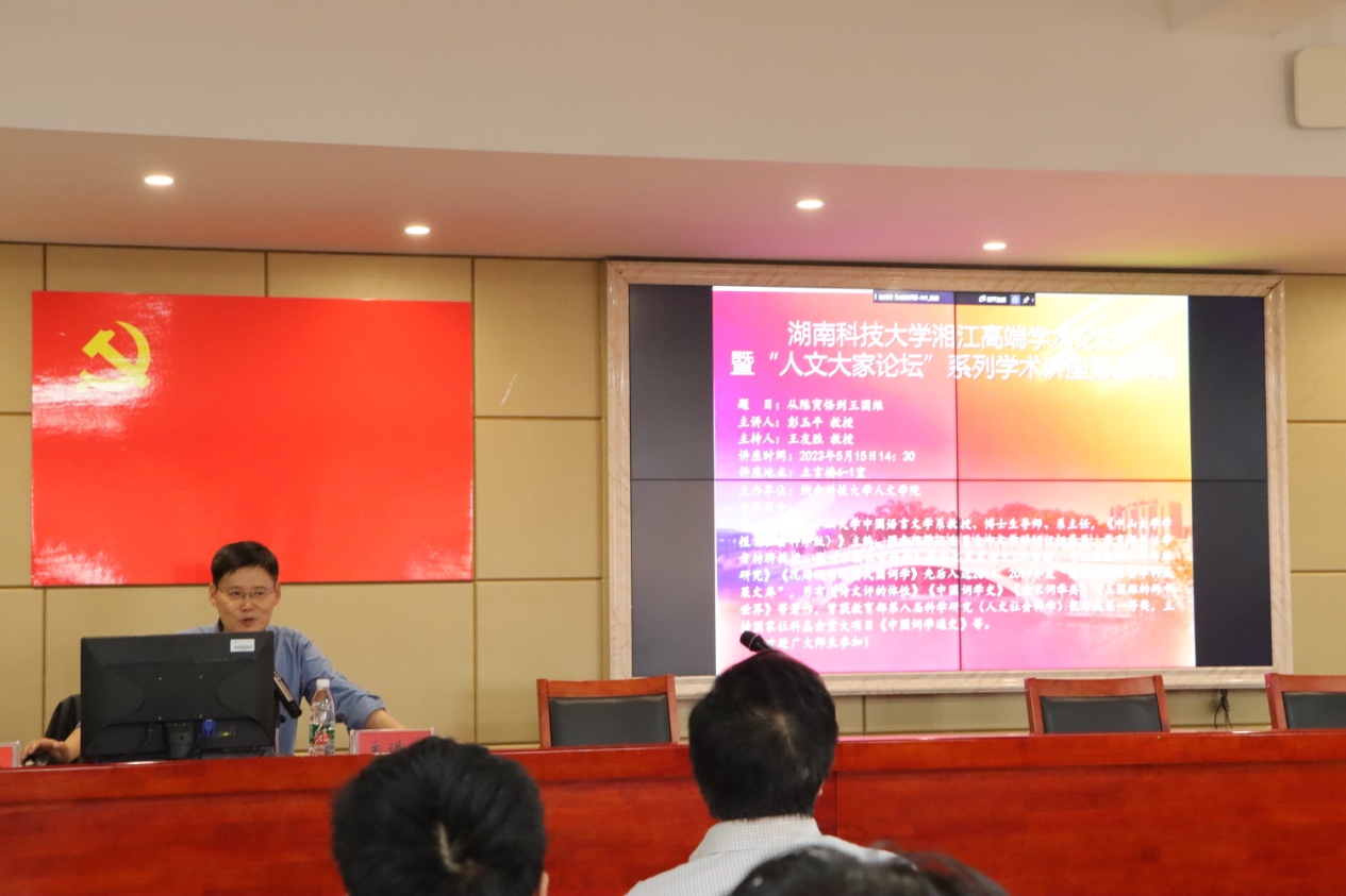 5月15日下午,我院于立言樓B4-1室舉辦湘江高端學(xué)術(shù)論壇暨“人文大家論壇”系列學(xué)術(shù)講座246講。中山大學(xué)中國(guó)語(yǔ)言文學(xué)系教授彭玉平應(yīng)邀來我院作主題為“從陳寅恪到王國(guó)維”的學(xué)術(shù)講座,我院教師及21級(jí)本科生代表到場(chǎng)參與,本次講座由王友勝教授主持。