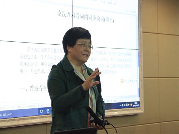 “我今天為什么站著講呢?因?yàn)閯偝粤送盹垼?lsquo;腹猶果然’。”王教授一開(kāi)口,就以幽默的話(huà)語(yǔ),活躍了現(xiàn)場(chǎng)氣氛,吸引了全場(chǎng)聽(tīng)眾。她從“果”字入手講解了詞的核心義與引申義,“‘果’原義是‘果實(shí)’,而多數(shù)果實(shí)的特征是圓潤(rùn)飽滿(mǎn),因此‘腹猶果然’。”王教授以“點(diǎn)”、“翹”、“奮”、“幅”與“副”、“只”與“雙”等常用詞為例,形象深刻地剖析了漢語(yǔ)詞匯從核心義到其他意義的演變,用簡(jiǎn)單、生動(dòng)的例子向大家展示漢語(yǔ)規(guī)律性。王教授說(shuō)“一個(gè)字、一個(gè)詞,就是一幅畫(huà),一首歌,語(yǔ)言文字其實(shí)是趣味橫生的。”王教授的講座就如王教授所說(shuō)的語(yǔ)言文字一樣,生動(dòng)有趣、充滿(mǎn)激情。