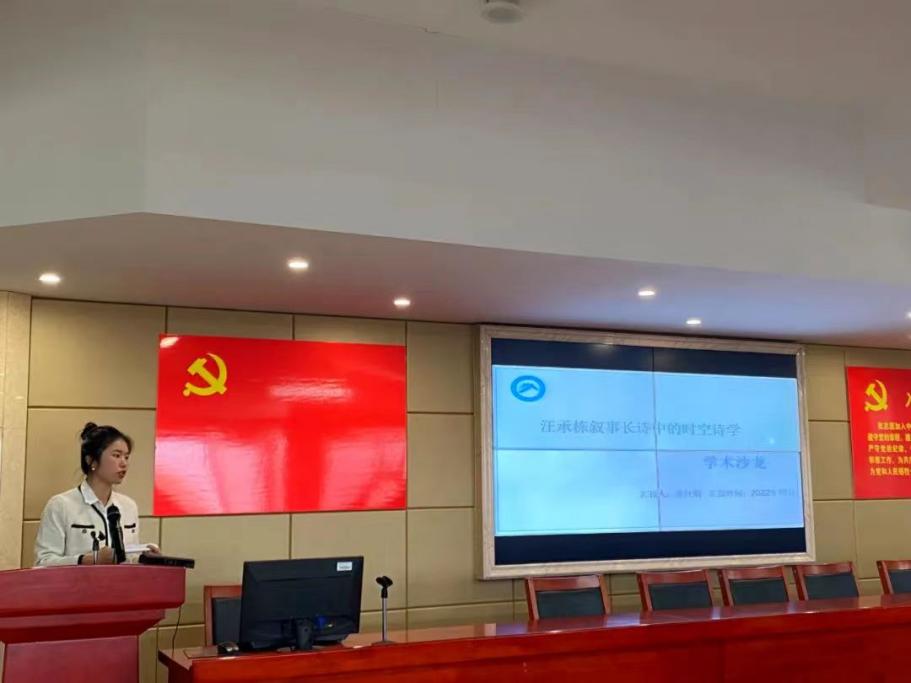 熊杜娟同學(xué)分享的題目是《汪承棟敘事長(zhǎng)詩中的時(shí)空詩學(xué)》,從時(shí)間的延宕和空間的拓展、時(shí)空意象的多維呈現(xiàn)形態(tài)、長(zhǎng)詩作品中時(shí)空結(jié)構(gòu)的塑構(gòu)三個(gè)層面進(jìn)行了剖析。