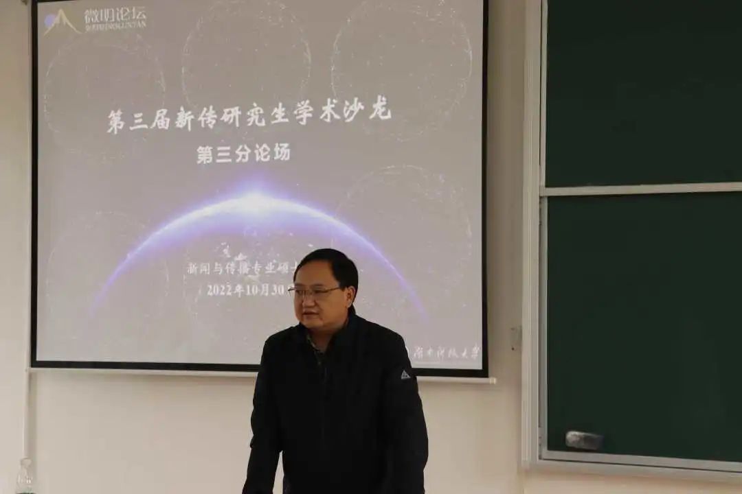 在論壇閉幕式上,新聞與傳播專業(yè)碩士點(diǎn)負(fù)責(zé)人陳功對整個論壇活動進(jìn)行了總結(jié)講話。首先,他總結(jié)了舉辦微明論壇的意義,并對同學(xué)們的學(xué)習(xí)成果予以充分肯定。其次,他號召研究生們在日常學(xué)習(xí)過程中勤思考勤交流。最后,他對此次參會的老師和同學(xué)們表達(dá)了衷心的感謝并發(fā)出邀請,期待明年與各位在微明論壇再會。本次學(xué)術(shù)論壇充分展現(xiàn)了新傳學(xué)子的學(xué)術(shù)風(fēng)采和精神風(fēng)貌,鍛煉了其學(xué)術(shù)研究能力,提升了青年學(xué)子的學(xué)習(xí)積極性。同時為我校師生搭建了高質(zhì)量的學(xué)術(shù)交流平臺,推動了學(xué)校學(xué)術(shù)氛圍建設(shè),共同見證了一段精彩難忘的學(xué)術(shù)之旅。(陳功 易靈敏 李葉群 黃文藝 李浩潔 陳可怡)