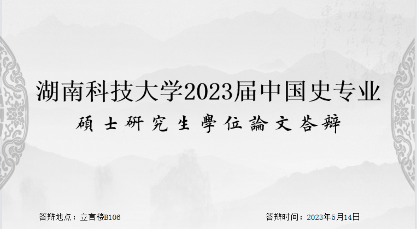 5月14日,人文學(xué)院2020級中國史專業(yè)碩士研究生學(xué)位論文答辯于立言樓B106如期舉行。本次答辯邀請湘潭大學(xué)章育良教授擔(dān)任答辯主席,湘潭大學(xué)吉成名教授以及我院徐紅教授、金身佳教授、周方高教授、聶志軍教授擔(dān)任答辯委員。2020級中國古代史方向8位碩士研究生參與此次答辯。
